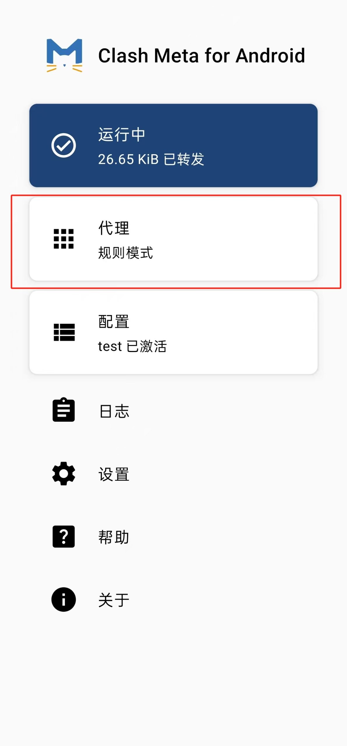 至此 Clash Meta for Android 已基本配置完成,你可以出国深造了!? 你还可以点【代理】按钮切换规则及节点,如下图所示: